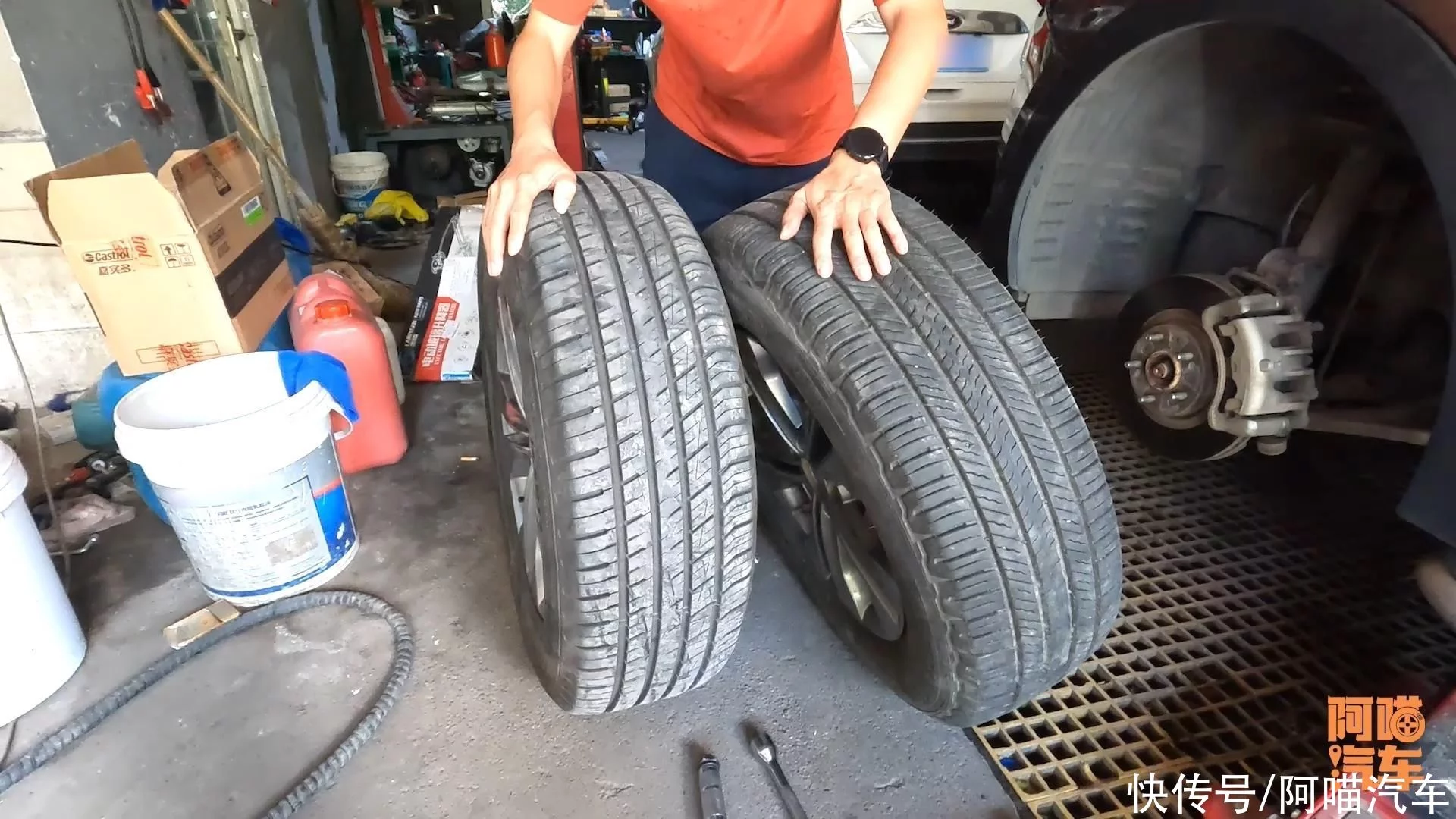 这个时候会出现,在换轮胎的时候,前轮的情况已经很恶劣了,但是后轮它还只磨了一半,还挺好。