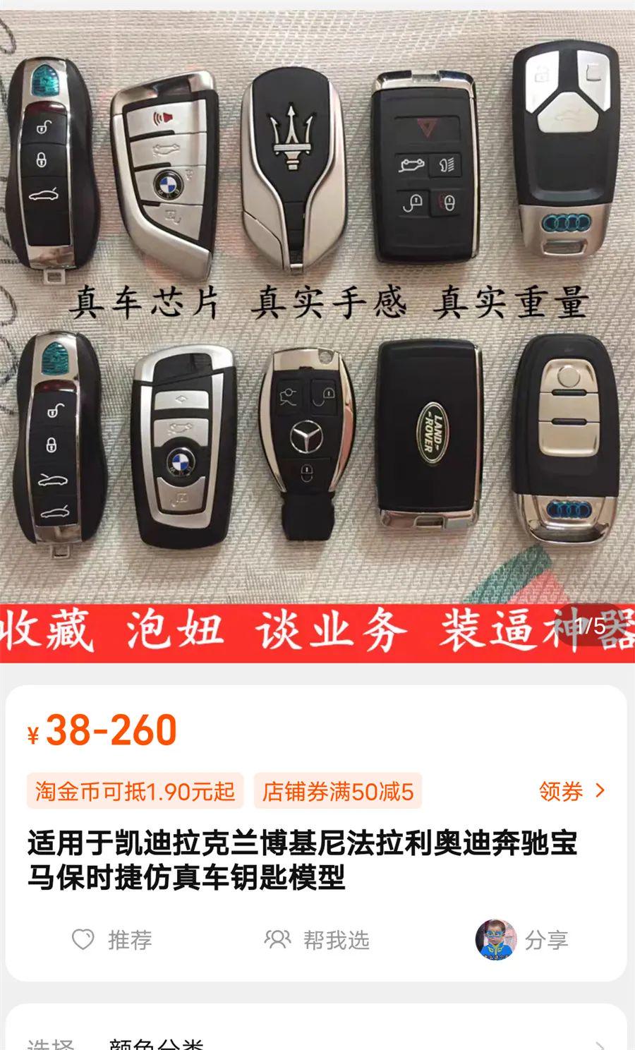 而为了配合社交平台发布的图片,几十块的假车钥匙成了宠儿。《汽车专业网》编辑发现,在淘宝等购物平台上,有不少销售豪车仿真车钥匙的商家。门店口号很直接,就是收藏把玩、泡妞、谈业务的装X神器。