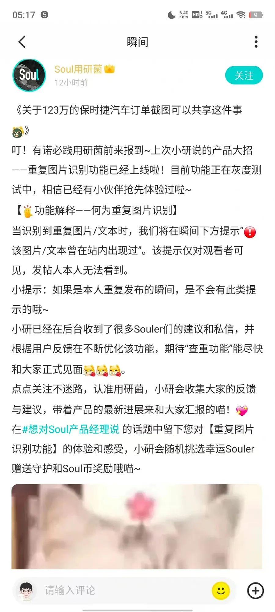 对于平台文字图片的查重功能,soul回应称,目前正在灰度测试。在谈到热议事件《关于123万的保时捷汽车订单截图可以共享这件事》,soul解释道,当识别到重复图片或文本时,soul平台将在内容下方提示“该图片/文本曾在站内出现过”。该提示仅对观看者可见,发帖人本人无法看到。如果是本人重复发布的瞬间,是不会有此类提示。