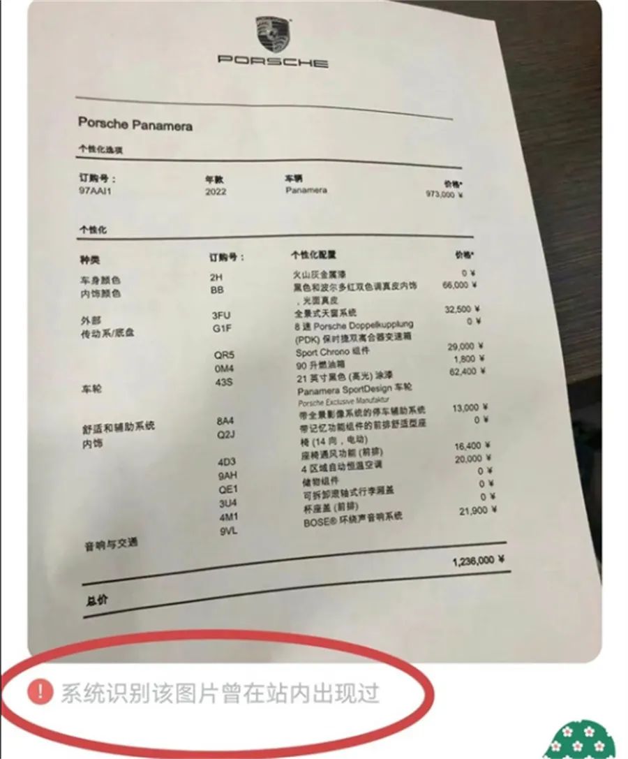日前,有网友爆料,在社交软件soul上,一名soul用户在平台上晒保时捷和一张123万的保时捷汽车订购单和一张疑似4S店现场照片。系统给这张图片标注为“系统识别该图片曾在站内出现过”。