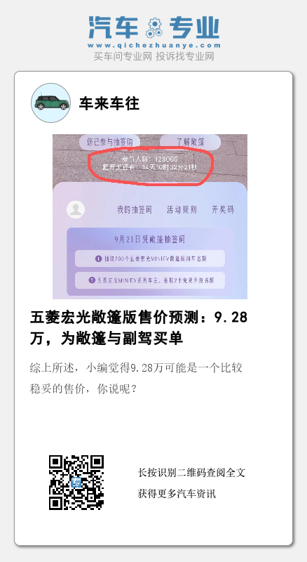 不过一个现实的问题是,“天选之子”会为自己的好运买单吗?不一定,因为有消息说MINIEV敞篷版的售价或定在10万元以上,让不少网友直呼太贵;但售价在8-10万元的话,情况就会缓和很多,看来10万元确实是个“分水岭”。小编根据当下的情况对新车售价做了个小小的预测:9.28万,不知道是否跟你的想法一样呢?