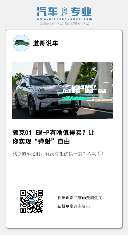 啊?听说了吗?作为中国认真玩赛车的第一品牌领克,居然对混动动手了,它能否成功呢?让我们一起来看看领克01 EM-P。外观上,新车整体与燃油版领克01差别不大,分体式大灯设计有着很强的领克辨识度,门把手、后视镜、侧裙护板、车顶、行李架以及轮毂等地方加了黑色元素的处理让车在运动中带有几分优雅。内饰上,三联屏的组合配上白加黑的内饰,也显得高雅。起步上新增了弹射起步功能,让你从开始就快人一步。动力上采用了电机+1.5T发动机+电池的动力组合,零百加速7.6秒,纯电续航里程为70km,综合油耗1.54L/100km,亏电油耗5.1L/100km。