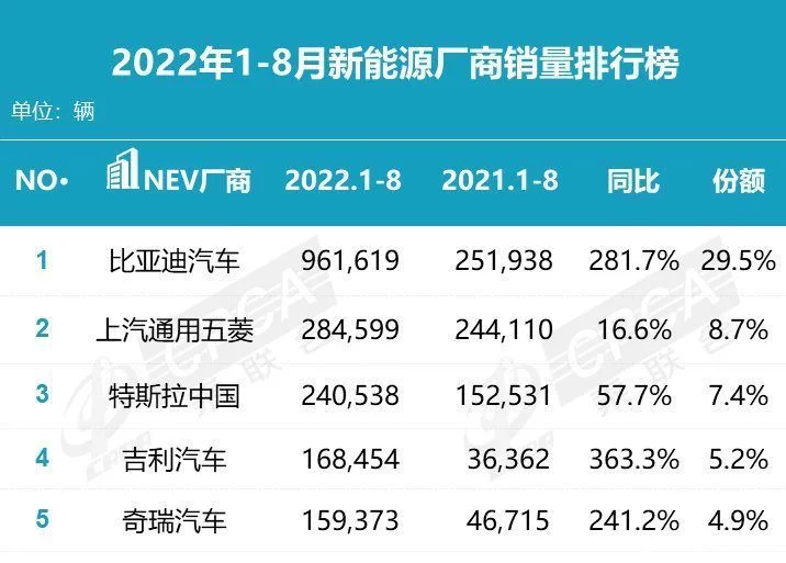 在特斯拉高歌猛进的同时,一家来自中国的自主汽车品牌向它发起了挑战,那就是比亚迪。根据乘联会发布的数据,8月比亚迪的销量达到168,885辆,同比大涨210.5%;今年1-8月,比亚迪的累计销量达到966,296辆,同比也增长了166.1%。