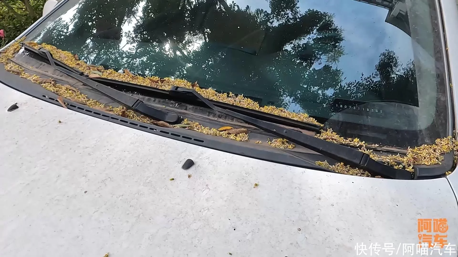 这个地方如果你开车的时候,特别注意,尤其是前面,全部是这种树叶花,一定不要急着喷水,可以先用雨刷干刮一下。
