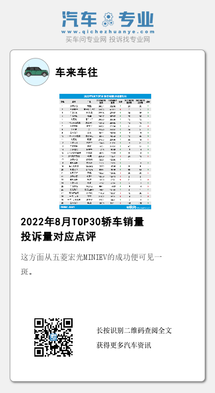 在8月份的质量问题中,“影音系统故障”投诉量持续攀升,稳居榜单首位,投诉量环比上涨69.9%。此外,“仪表台开裂”和“部件老化”投诉量也延续了上个月的增长势头,环比分别上涨31.4%和32.4%。在服务问题中,“与宣传不符”再次突破千宗,较7月份上涨69.3%。“原车配套不全”投诉环比再次出现大幅增长,排名升至第二位,投诉量已突破700宗,投诉增量主要来自于部分德系豪华品牌车型。去除投诉人自愿申请撤诉的信息后,2022年8月TOP30轿车销量投诉量排名如下: