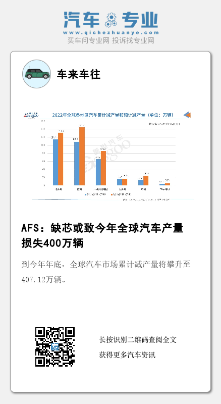 根据汽车行业数据预测公司AutoForecast Solutions(以下简称为AFS)的最新数据,截至9月11日,由于芯片短缺,今年全球汽车市场累计减产量约为323.2万辆。AFS预测,到今年年底,全球汽车市场累计减产量将攀升至407.12万辆。