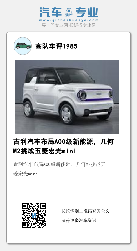 日前,从工信部第362批次新车公告获悉,吉利汽车将布局A00级别的新能源汽车市场,几何汽车M2申报图亮相本次新车公告。几何M2(图片)定位是一款三门四座的A00级微型车,其长宽高分别为3065*1522*1600mm,轴距为2015mm。电池方面,使用了国轩高科的磷酸铁锂电池,预计续航里程将和五菱宏光mini保持一致,提供120公里、170公里和200公里多种续航。动力方面,搭载20KW、30KW两种动力的永磁同步电机,和同级别车型保持动力水平保持一致。