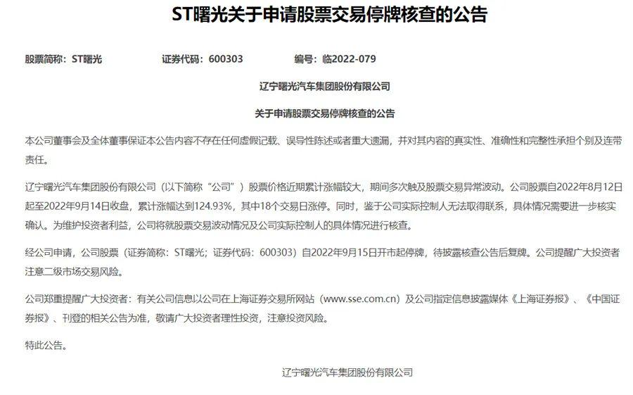 值得一提的是,就是这么一个充满戏剧性的公司,却2022年8月12日至2022年9月14日收盘,累计涨幅达到124.93%,其中18个交易日涨停。也正是因为如此,ST曙光触发了新的副本——停牌。