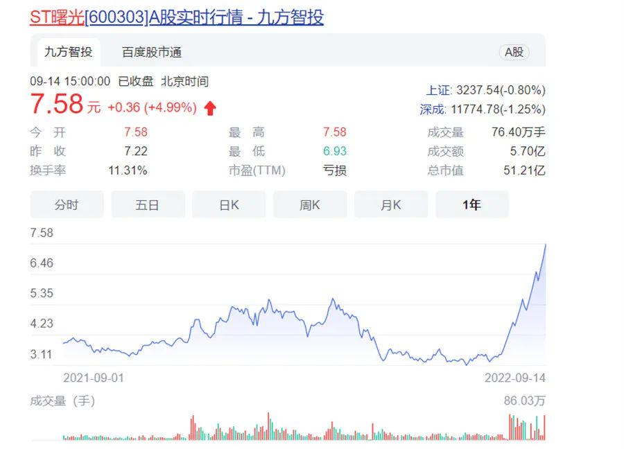 而在此之外,同样离谱的还是ST曙光惨淡的基本面与连续的涨停对比。数据显示,今年上半年ST曙光实现营业收入8.57亿元,同比下降39.17%;归属于上市公司股东的净利润为亏损1.05亿元。但亏损的ST曙光,股价却在近期连刷涨停板,2022年8月12日至2022年9月14日收盘,该公司股票已经斩获18个涨停。