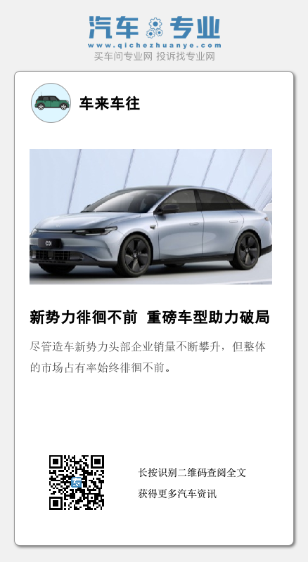 在此背景下,造车新势力不断推出重磅车型,希望打开目前的僵局。其中,创维汽车推出创维HT-i,剑指10万辆销量目标;AITO品牌推出问界M5 EV,满足更多消费者个性化出行需求。此外,小鹏汽车推出智能旗舰SUV——G9,助力品牌向上发展;零跑汽车推出C01,在入局轿车市场的同时,进一步完善产品矩阵。