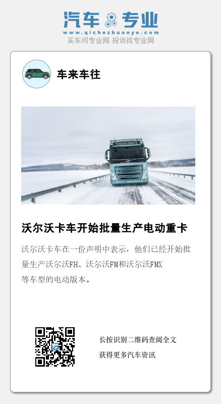 沃尔沃卡车在一份声明中表示,他们已经开始批量生产沃尔沃FH、沃尔沃FM和沃尔沃FMX等车型的电动版本,这些车型约占该集团总销量的三分之二。该公司还补充说,现在沃尔沃在全球范围内共有六款电动卡车在批量生产之中。