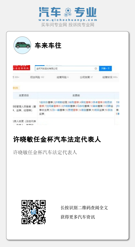 天眼查App显示,近日,金杯汽车股份有限公司发生工商变更,刘同富卸任法定代表人、董事长,由总裁许晓敏接任;同时原董事哈刚、吴粒等退出,新增董事钟田丽、吴增仙等。