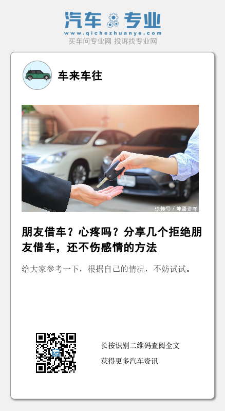很多朋友买来新车都要在朋友面前炫一炫,在受到很多朋友的祝贺同时也难免有朋友会张口借车,其实大多数的朋友心中都是有各种不情愿,碍于情面和交情,左右为难,不想借还说不出理由。