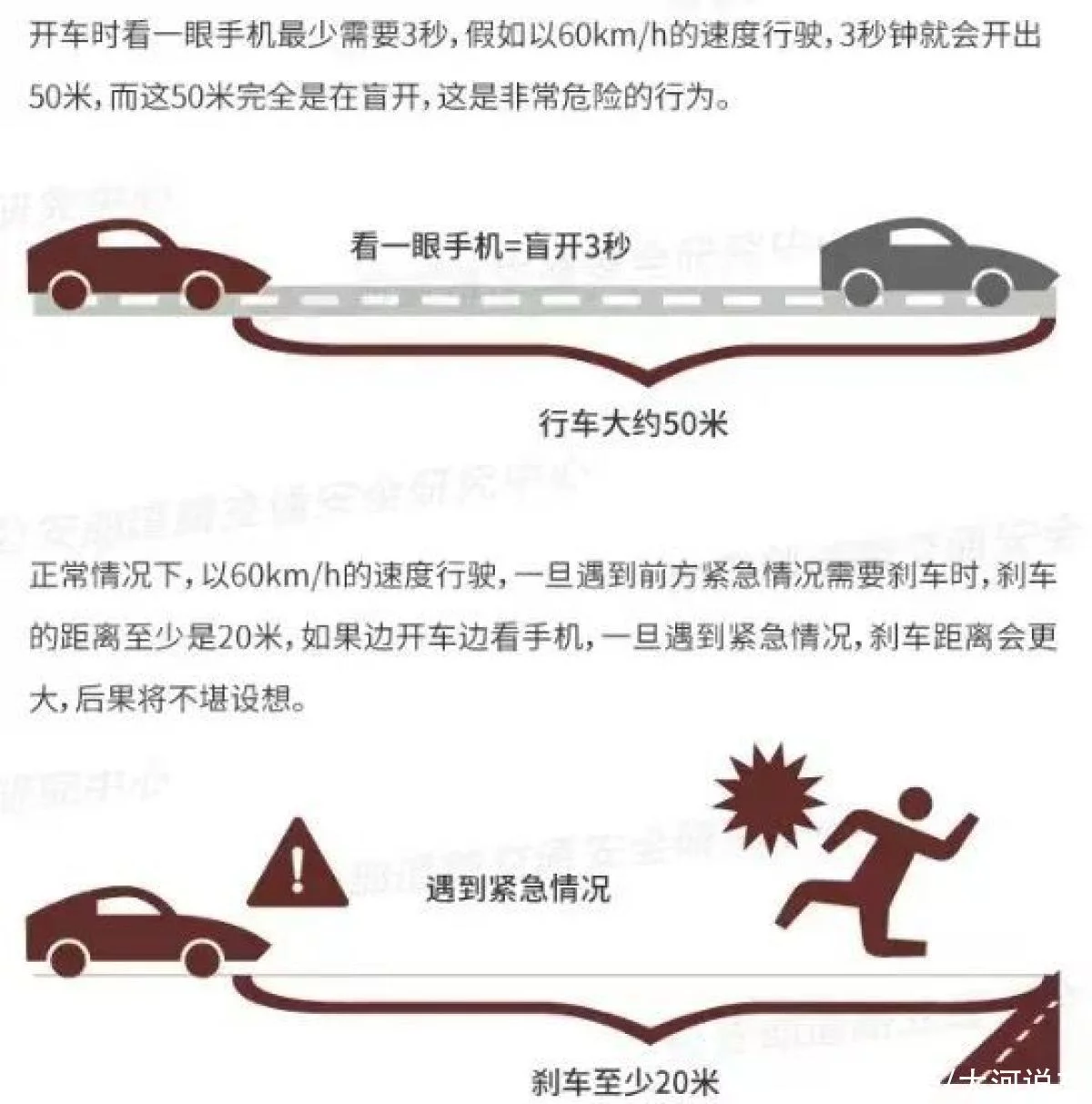 据研究表明,正常驾驶时,驾驶人反应时间在0.3~1秒,使用手机时反应时间延迟3倍左右。