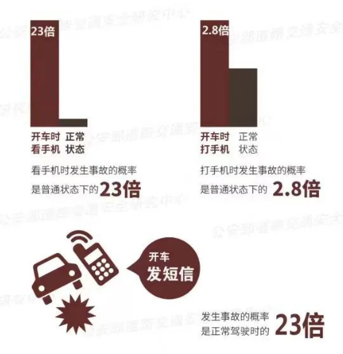 因此,开车使用手机发生事故的概率是普通驾驶时的23倍。而且开车使用手机是违法行为,一旦发生事故,必将受到法律的严惩。
