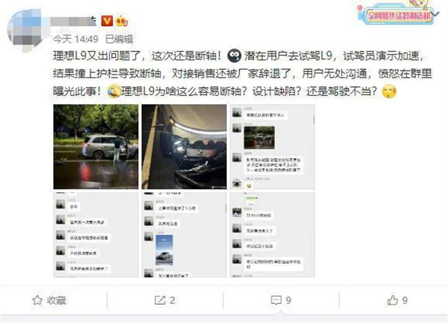值得一提的是,7月26日,一位博主曝光的截图显示,客户称其去试驾理想L9,在试驾员演示加速过程中,突遇三道变二道,试驾员反应不急,连撞几十米护栏,该客户称主动刹车失效、前轴气囊都爆了。图片显示该车左侧前保险杠碎裂,前脸接近“毁容”,事故现场一片狼藉,还好理想L9的激光雷达在车顶,如果在前保险杠上就损失就更大了。