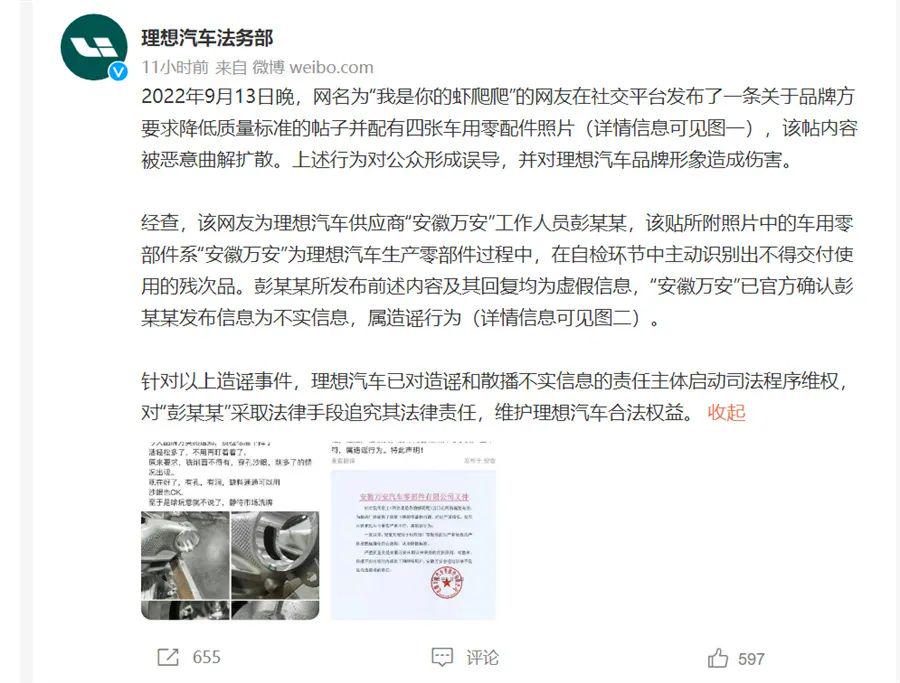 显而易见,理想汽车对老车主还是十分不舍的,只不过目前理想ONE仍属于热门投诉车型。近日,理想汽车开通了“理想汽车法务部”官微,上线后的第一条博文就向一位供应商工作人员发起了维权。该博文宣称,理想汽车某供应商的工作人员彭某某在社交平台上发布虚假信息,“对公众形成误导,并对理想汽车品牌形象造成伤害”,“理想汽车已对造谣和散播不实信息的责任主体启动司法程序维权”,并将追究彭某某的法律责任。