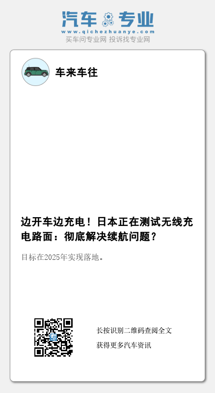 目前,智能电车最棘手的问题依然是无法充分满足车主们的充电需求,相较于固定的充电桩,无线充电技术被业界人士认为会是智能电车充电的最优解方案之一。在最新的披露中,日本已经开始测试利用无线充电装置及线圈铺设的道路,当一辆行驶速度为每小时15公里的小型电动汽车通过时,便能实现“边开车边充电”的操作,但具体的充电功率暂未公开。不得不说,相较于固定的充电桩,无线充电道路的意义在于减少固定排队的情况,但假如充电功率不足、行驶速度有要求,似乎也并不能解决排队的问题。