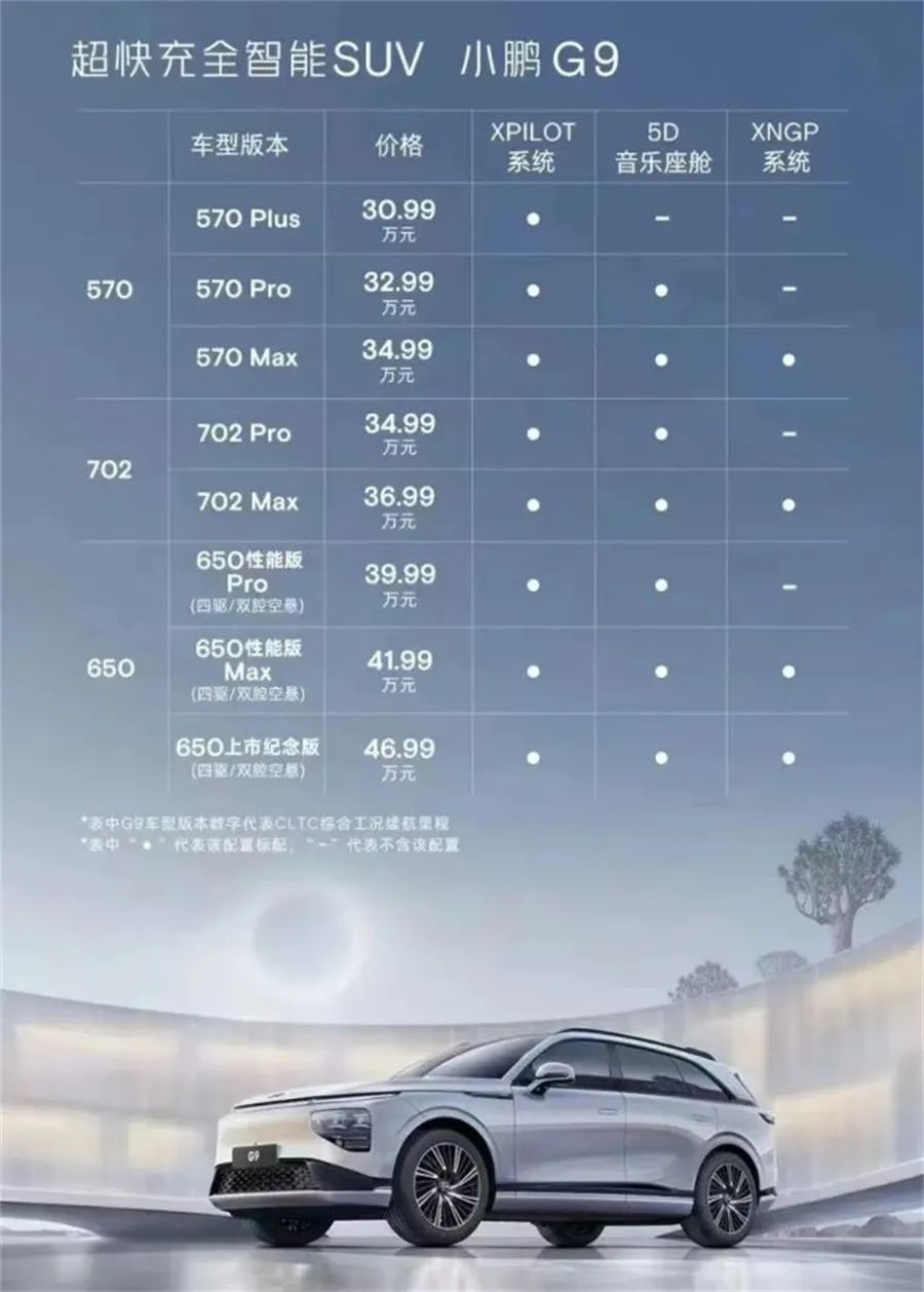 最初上市之时,小鹏G9共推出了6款车型,包括570 G、570 E、702 E、650 E性能版、650 X性能版、650 X上市纪念版。这么看,尽管不如隔壁理想L8精简,但也不至于让人难以接受。但问题就出在了小鹏G9的三大主推的核心优势,都是需要选装的。