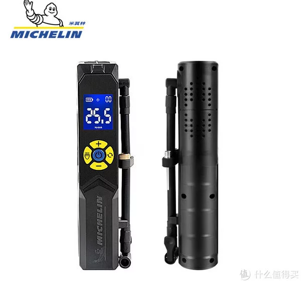 这款米其林车载充气泵,将气管连接到轮胎即可显示当前的胎压。然后在充气前选择好模式,按照所需压力设定好胎压值,开始充气后,达到设定的胎压值就会自动停止充气。