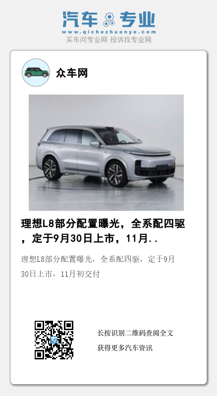 日前,我们从相关渠道获悉,理想L8(图片)部分配置曝光,该车将在9月30日正式上市,作为理想ONE的换代车型,新车采用了与理想L9相似的设计语言,车身尺寸有所增加,全系标配四驱、空气悬架等配置,上市后该车将在11月初开启交付。