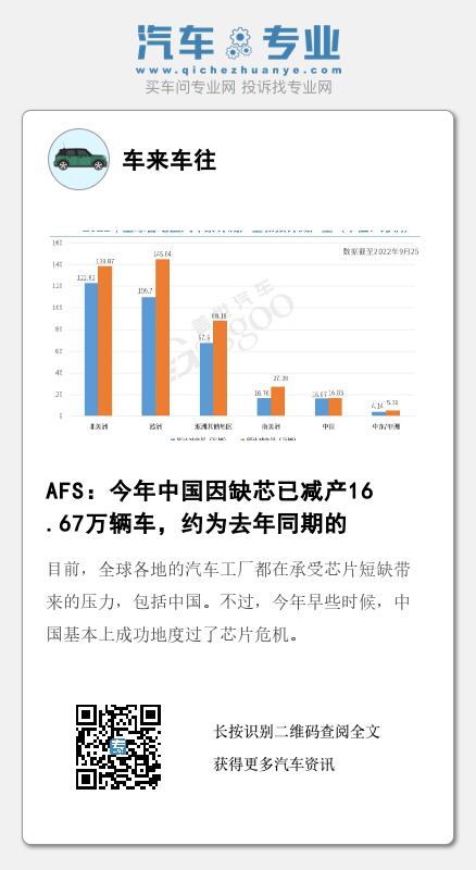 AFS预测,截至9月25日,由于芯片短缺,今年全球汽车市场累计减产约337.68万辆汽车,而全球汽车市场去年同期的累计减产量高达893.4万辆,几乎是今年同期的两倍多。其中,今年迄今中国地区因缺芯累计减产16.67万辆汽车,而中国地区去年同期的累计减产量约为这一数字的10倍。AFS预测,到今年年底,全球汽车市场累计减产量将攀升至420万辆左右。