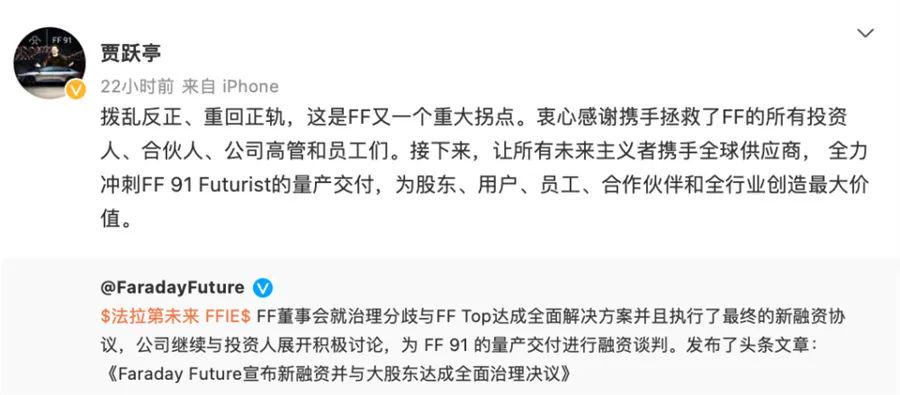 根据协议,FF创始人贾跃亭率FF合伙人公司成功重组上市公司董事会,现任执行董事长苏珊·斯文森、原董事长(现任董事)Brian Krolicki将引咎辞职。