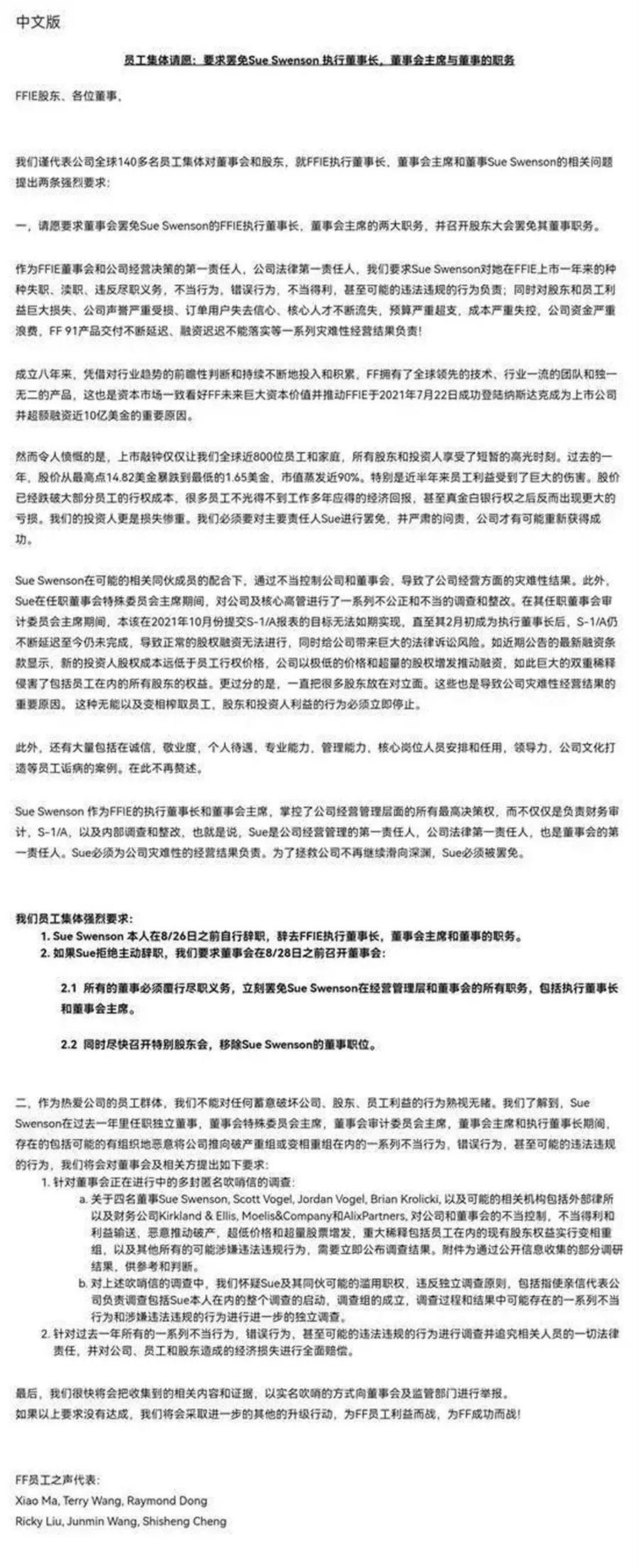 请愿书指出,Sue Swenson为FFIE董事会和公司经营决策的第一责任人,应该对上市一年来的违反尽职义务负责,同时为导致公司资金严重浪费、FF91产品交付不断延迟等一系列问题负责。