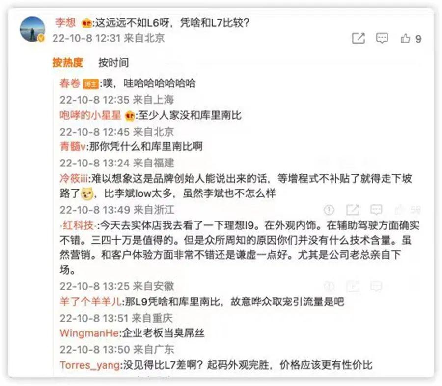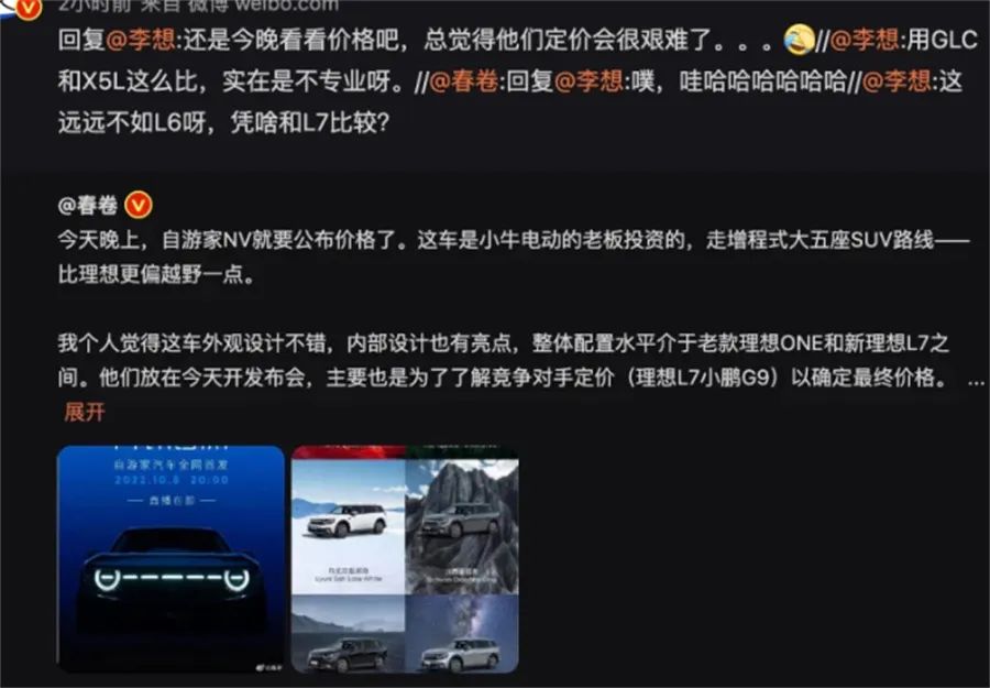 不知是为了蹭自游家NV的热度还是刻意想给自己制造话题,理想汽车创始人李想在一条将自游家NV与理想L7进行比较的微博下回应称“这远远不如L6呀,凭啥和L7比较”。随后更是回复“用GLC和X5L这么比,实在是不专业呀。”