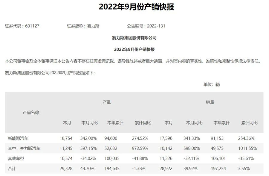 10月9日,赛力斯(601127.SH)发布了9月产销快报,其9月新能源汽车销量达17596辆,同比增长341.33%。其中,赛力斯汽车9月销量为10142辆,刚好突破一万大关,同比增长598%。也就是说,继8月赛力斯(问界系列)销量首次突破万辆,并创下新能源车企最快销量破万的记录后,赛力斯又保持住了这份优势。