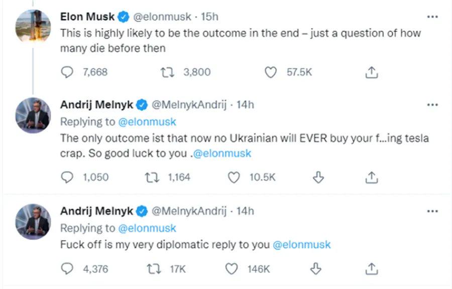 马斯克还提到自己之所以提出这个建议,是因为不希望“数百万人可能会为了基本相同的结果,而不必要地死去”,暗示了自己对乌克兰的军事和外交行动没有信心。马斯克的“投票”发布后引发了巨大争议,乌克兰官方和不少网友都批评他变相支持俄罗斯。就连乌克兰总统泽连斯基也直接发布推文表达了对马斯克的不满。而在这些官方人物的抗议声中,以乌克兰驻德大使梅尔尼克的措辞最为激烈和严厉。