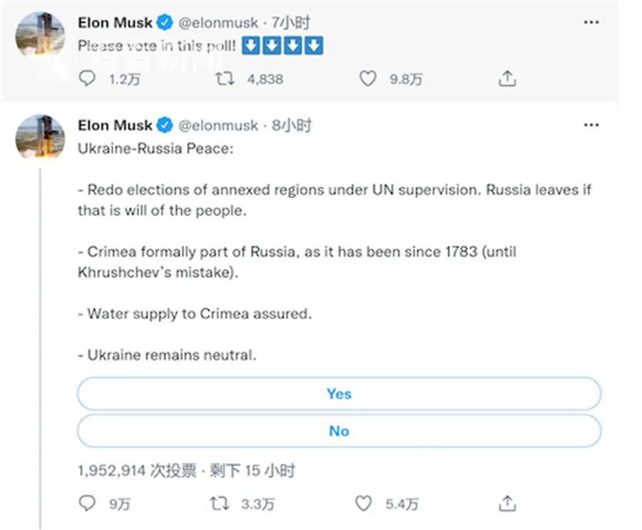 马斯克的“嘴炮”总是让人猝不及防,甚至在上周还“操心”起了世界和平问题,其在社交媒体发起了一项投票,他提出了自己针对俄乌冲突的和平解决计划,内容包括让顿涅茨克、卢甘斯克、扎波罗热、赫尔松四地重新进行公投;承认克里米亚加入俄罗斯;保证克里米亚的供水;乌克兰保持中立等方案。