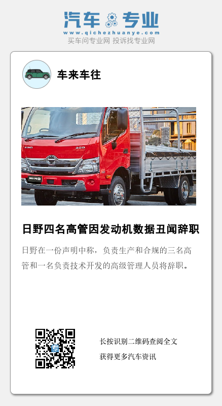 日野在一份声明中称,负责生产和合规的三名高管和一名负责技术开发的高级管理人员将辞职。该公司表示:“日野致力于认真反思我们过往的错误,我们的行为已经极大地影响了客户和其他利益相关者。”该公司承诺将做出持久的改变。