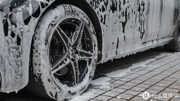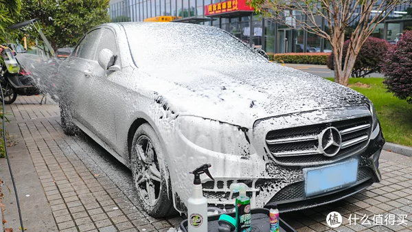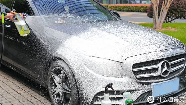 下面进行PA洗车,考虑到不用擦拭车身所以预洗液就多倒了一些,可以让泡沫更加浓密一些,但是也可能会导致流挂效果不好,都停留在车漆表面,这一点老陈掌握得恰到好处。