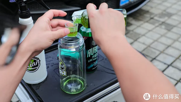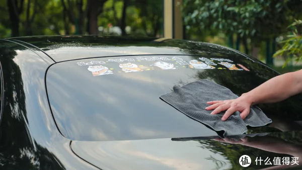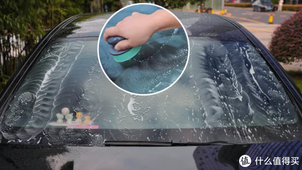 油膜去除剂涂在海绵上,在前挡风玻璃上边打圈圈,避免有遗漏的地方。