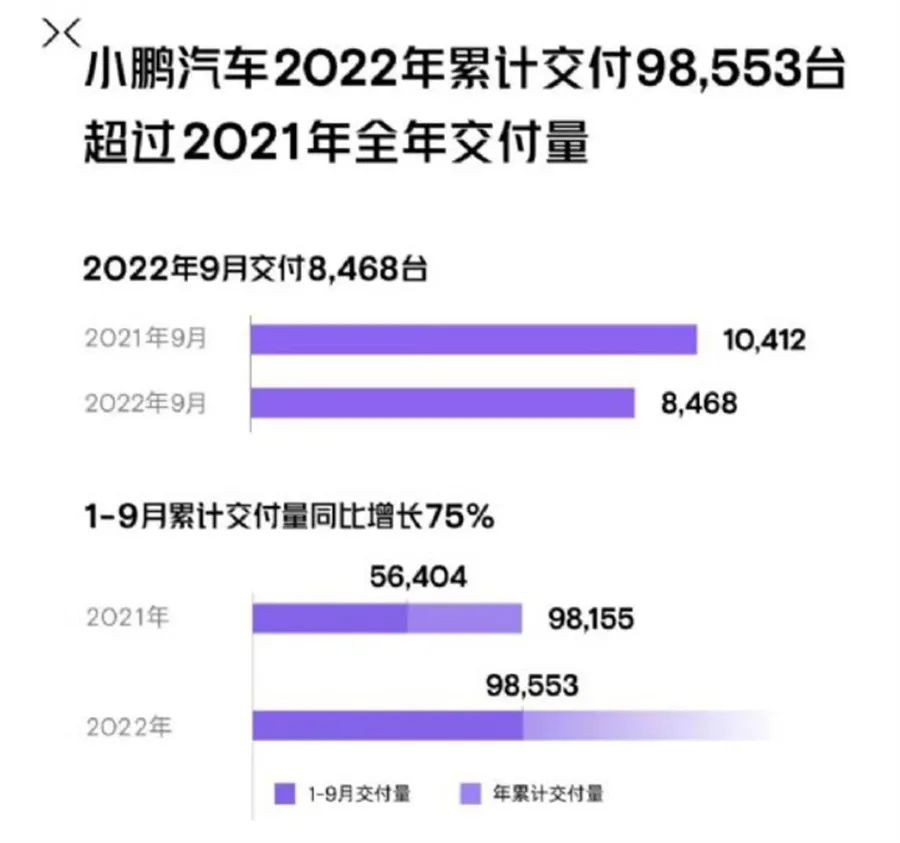 小鹏是“蔚小理”当中唯一出现环比下滑的的车企,在造车新势力排名第六。小鹏汽车10月1日公布的销量数据显示,2022年9月小鹏汽车新车交付8468辆,同比下降22.96%,环比8月份减少11.59%。其中,小鹏P7交付量4634辆,小鹏P5交付量2417辆,小鹏G3i交付量1233辆。