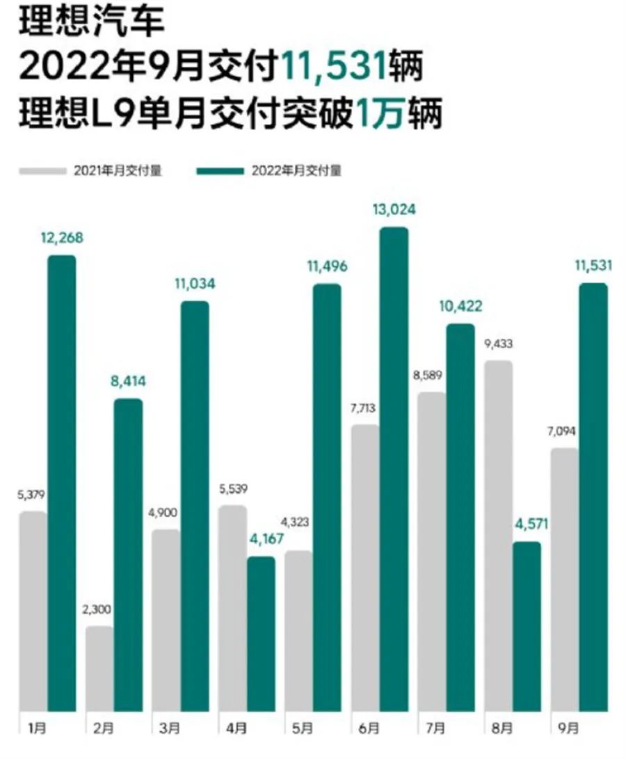 近日,理想汽车官方公布了9月新车交付数据。数据显示,2022年9月理想汽车新车交付11531辆,同比增长62.5%,环比8月份增长152.26%。