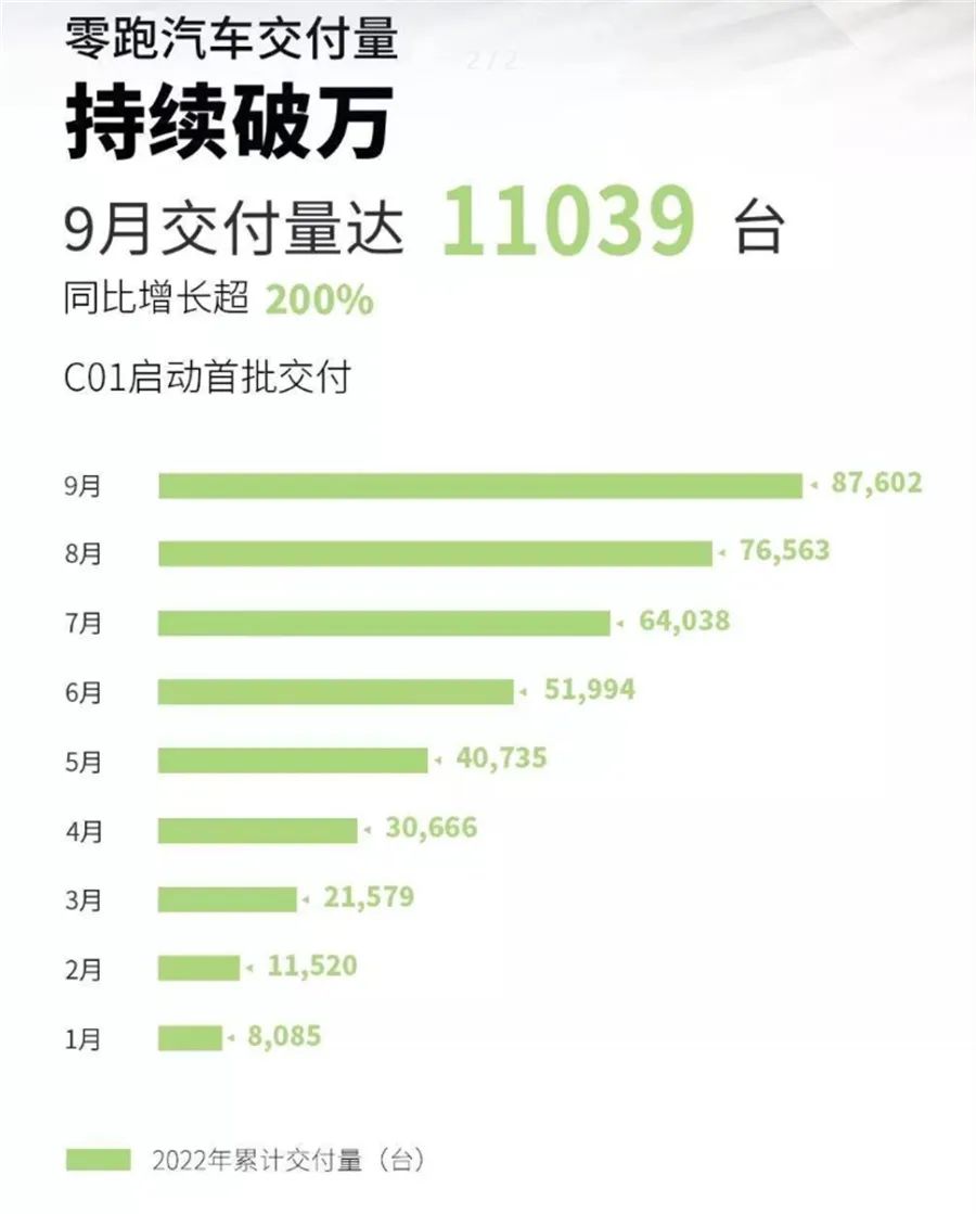 而与哪吒汽车一般主打低价小车的零跑则位于造车新势力销量第三名,9月交付量达11039台,实现连续破万,同比增长超200%,环比8月份则下降11.86%。不过,其销量的“含金量”同样不高,大部分来源是主打低端的零跑T03。高端车型零跑C01虽然已经上市,官方表示目前零跑C01的市场成功并不会那么快见效