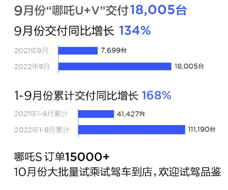 哪吒汽车今年累计销量111190万辆,同比增长168%。
