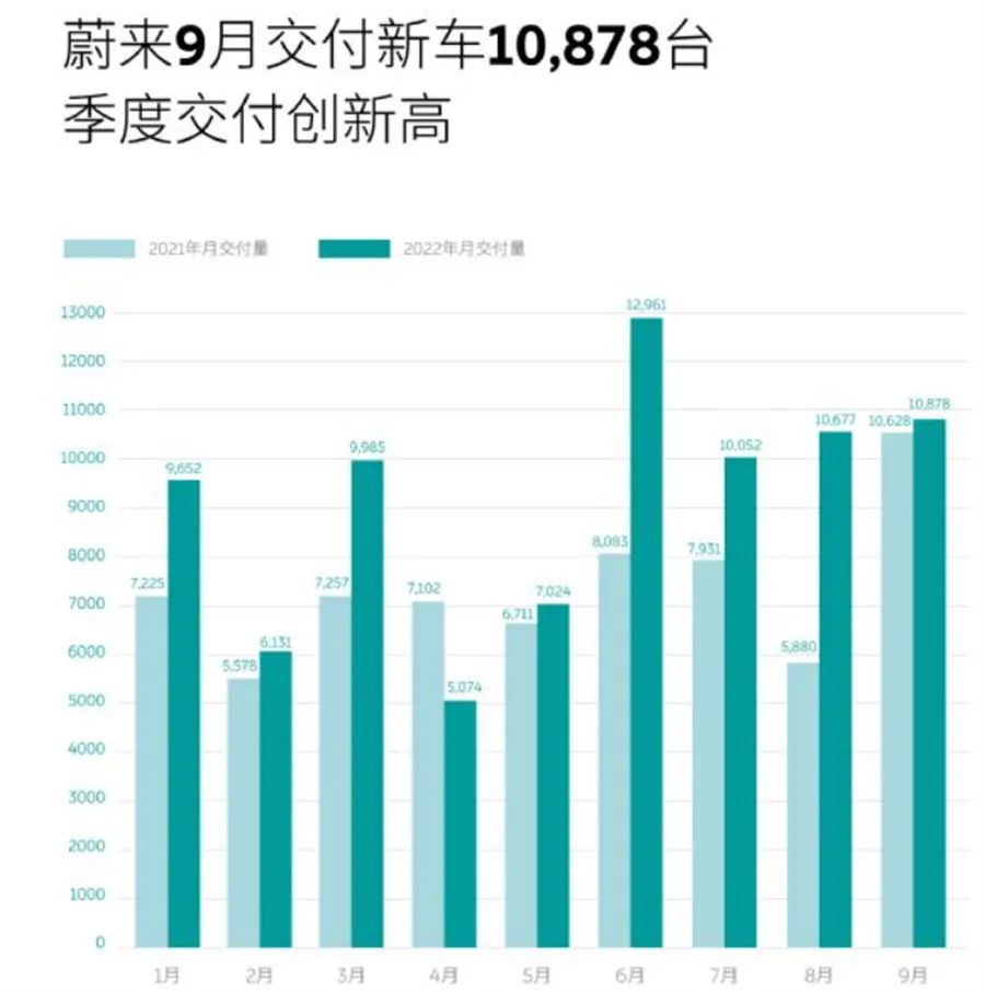 排名第四的蔚来创下第三季度交付新高,10月1日,蔚来汽车官方公布了9月销量数据。数据显示,2022年9月蔚来汽车新车交付10878辆,同比小幅增长2.40%,环比增长1.88%。2022年1-9月,蔚来汽车累计新车交付82434辆,累计同比增长24.16%。