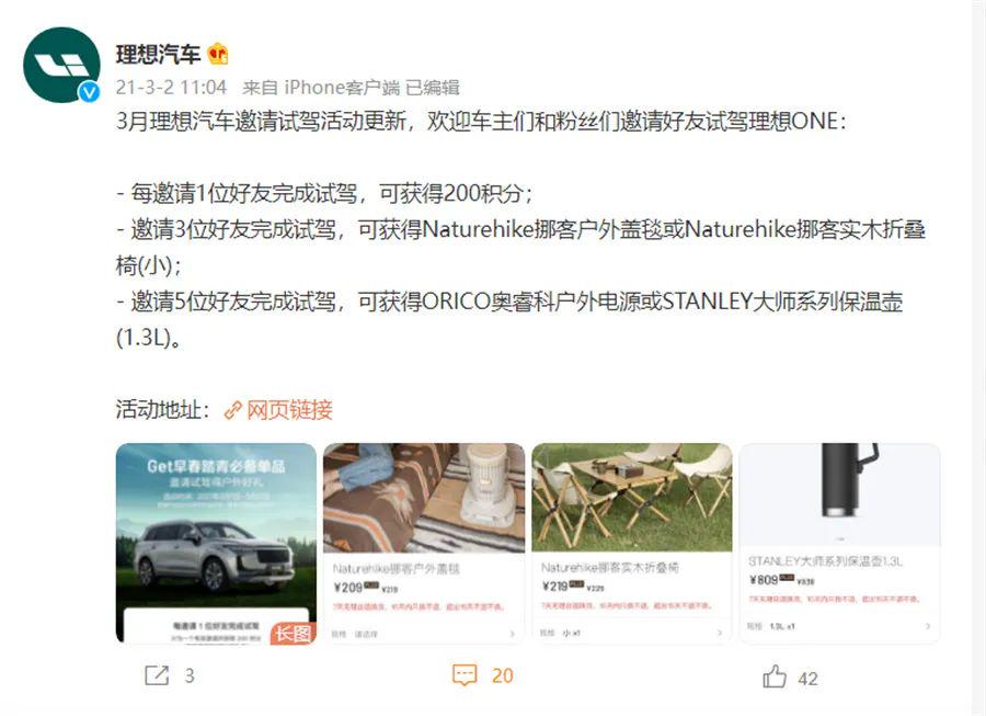 事实上,如理想汽车一般的“积分权益”在造车新势力中并不少见,以被“偷家”的小鹏汽车为例,除了可以在购车时获得定额积分之外,也有通过邀请车友试驾、购车赚取积分的方式,根据小鹏汽车此前发布的积分权益,2022年10月1日—10月31日期间,车主及预定车主邀请首资好友试驾/提车享5000积分/个奖励,邀请首资好友完成试驾给予邀请人400积分/个奖励,待邀请双方车辆均已交付给予邀请人4600积分/个奖励。