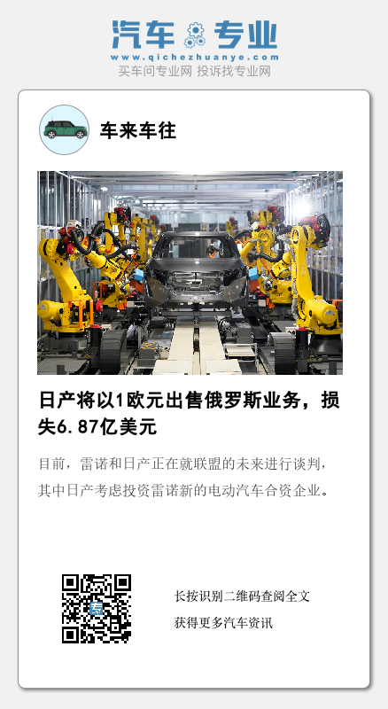 日产汽车表示,将以象征性的1欧元的价格将其俄罗斯业务转让给俄罗斯国有实体NAMI,此举将使日产损失约1000亿日元(合6.87亿美元),也是自雷诺以后又一家以高昂代价退出俄罗斯市场的国际汽车制造商。