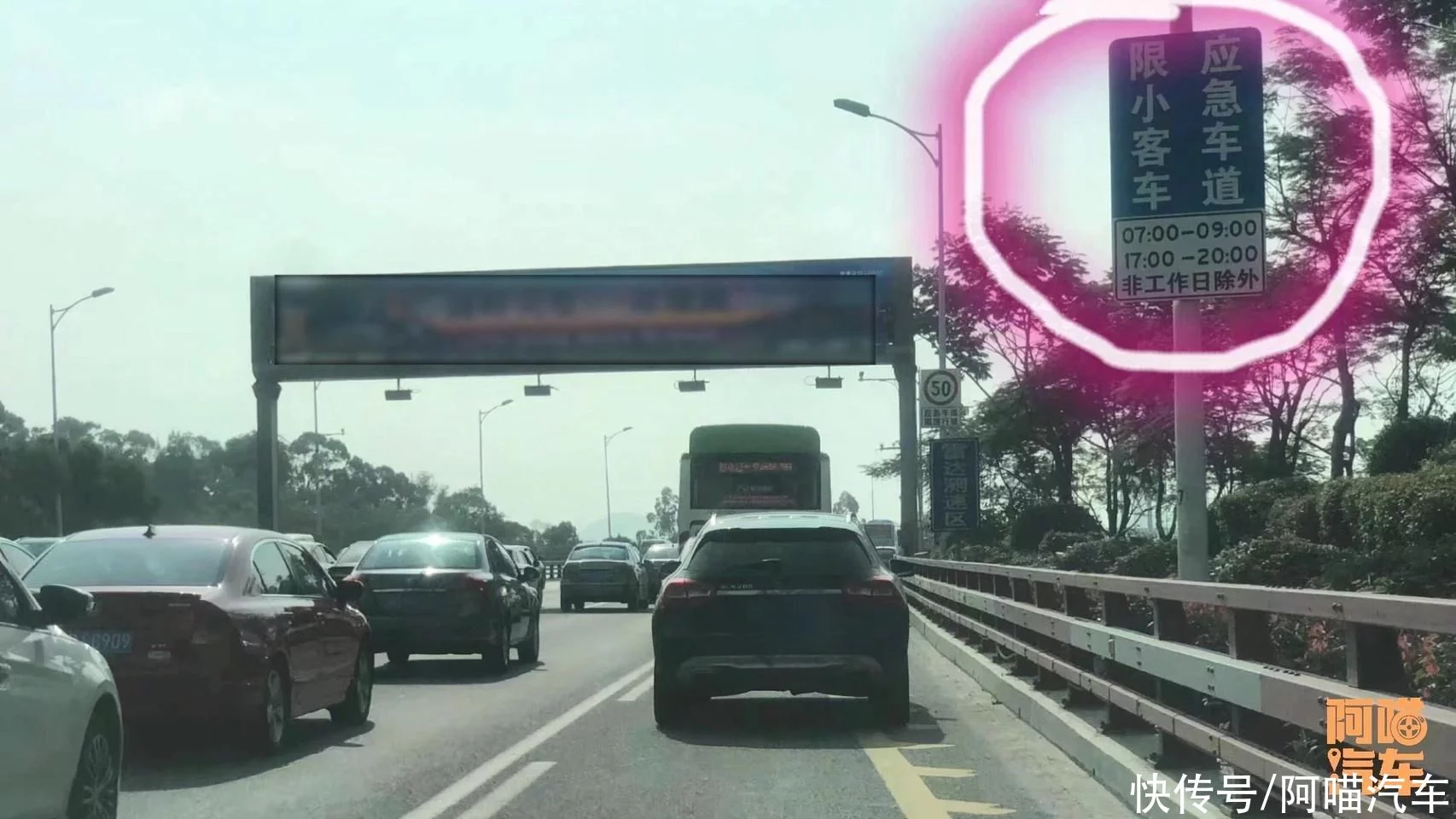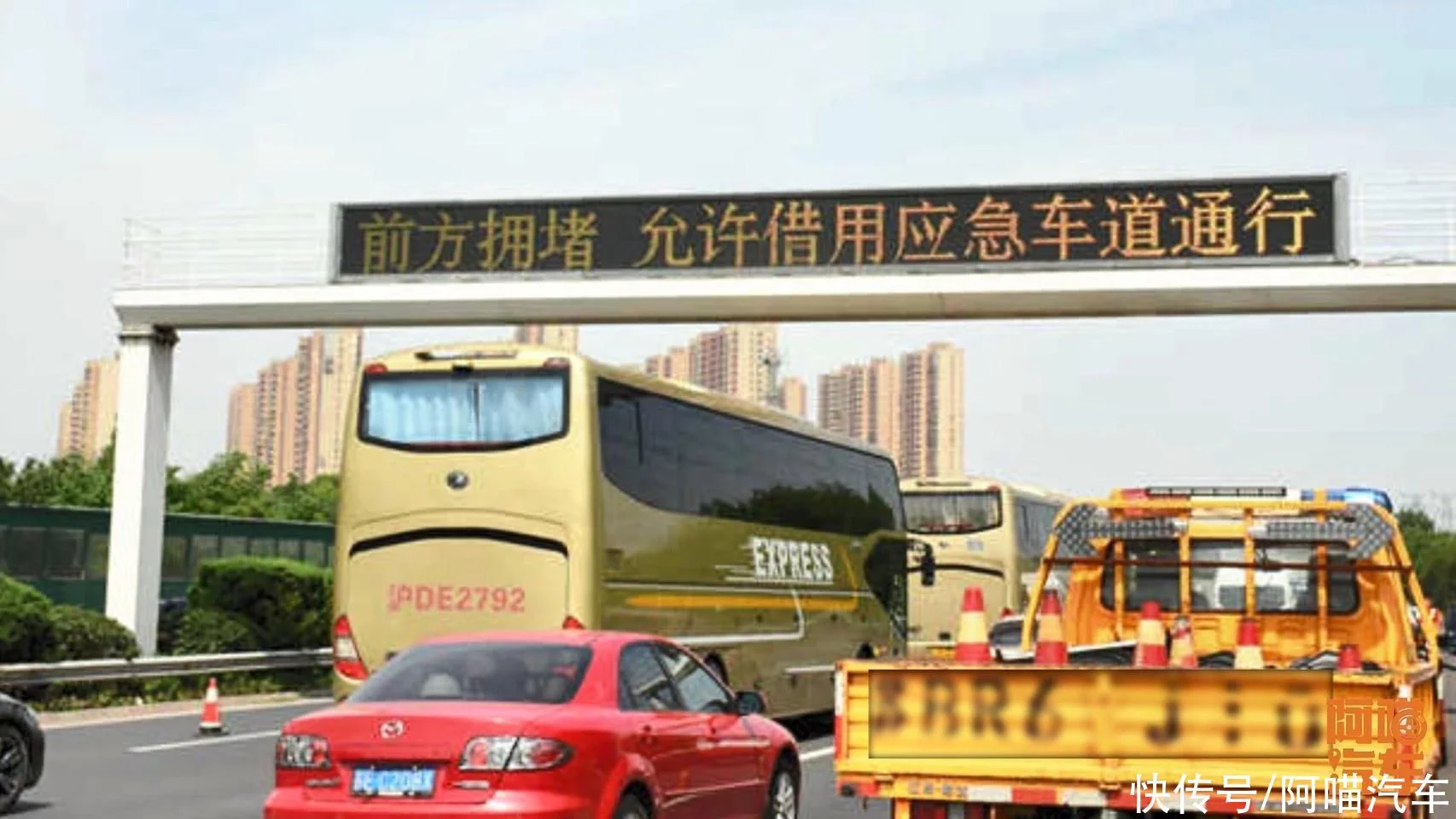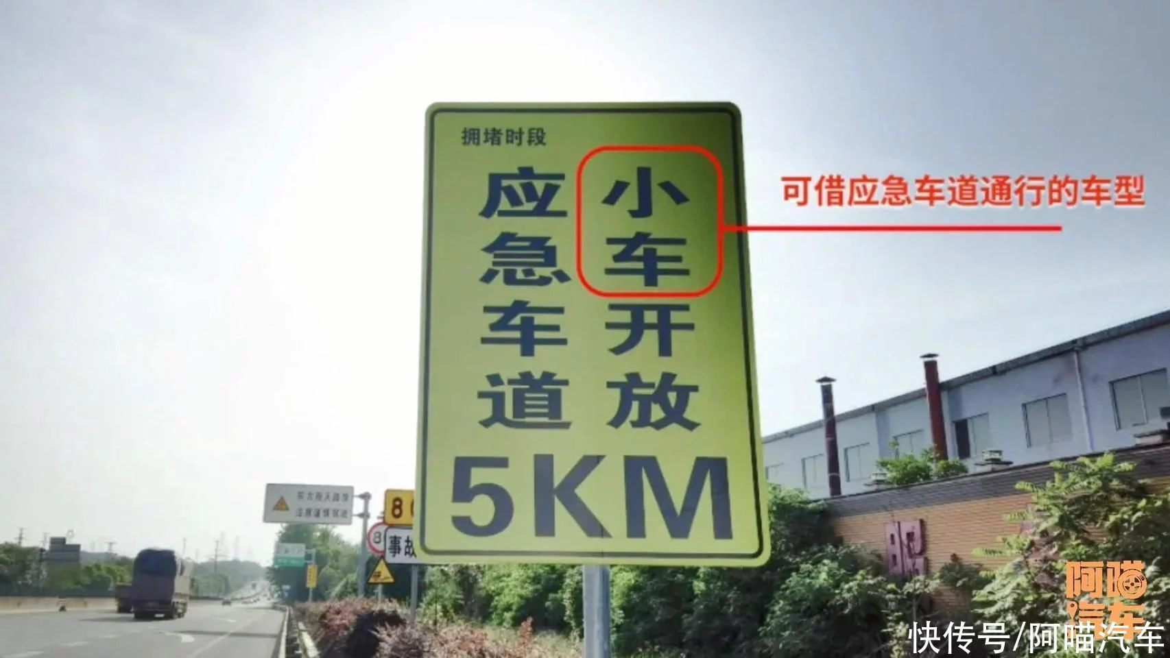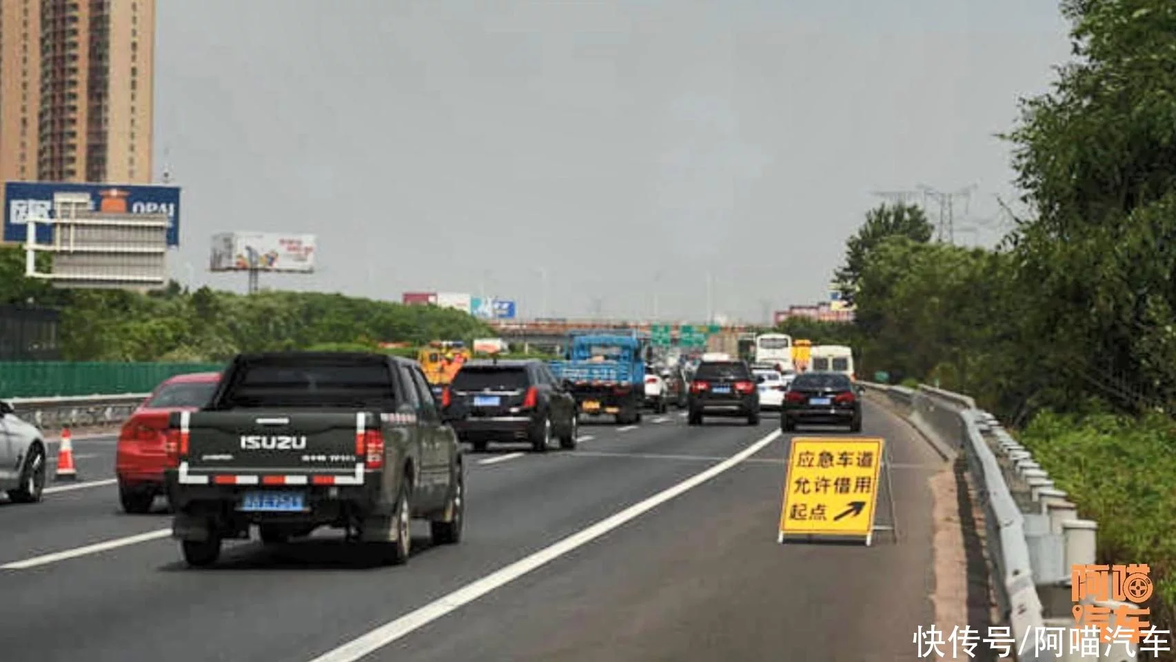 上面竖了个牌子,牌子在上面写着,允许借用应急车道,我相信90%的人,都会摸一下头脑。