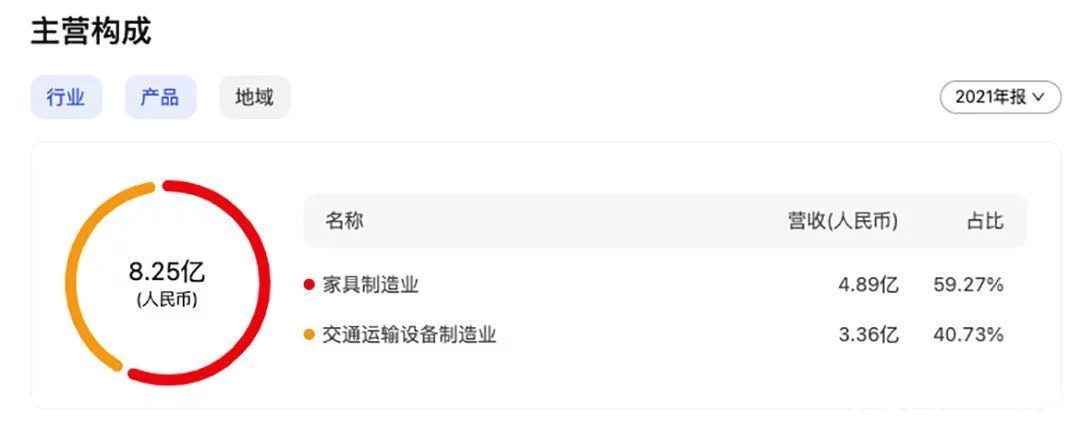 所以在2021年,众泰也只是小亏而已,亏损7.15亿元,其中研发费用2096万元,管理费用7.78亿元,营收8.25亿元。耐人寻味的是,这8.25亿元其中有59.27%是家具制造业提供的。