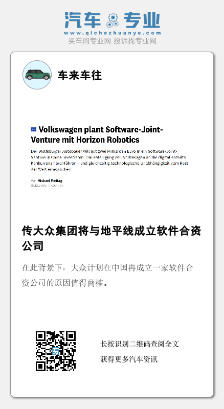 事实上,几天以前就有报道称大众正计划在中国投资一家软件生产合资企业,并计划于本周宣布投资消息,不过当时外媒并未透露大众将与哪家中国企业合作,有猜测称是华为,不过现在看来地平线更有可能。