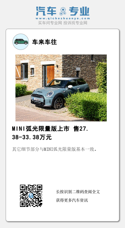 日前,车质网从MINI官方获悉,MINI弧光限量版车型正式于国内上市,分别推出MINI COOPER三门、五门和MINI CLUBMAN三个版本车型,售价区间为27.38-33.38万元。新车在外观上采用了专属元素,带来更具个性的视觉效果。据悉,新车共发售800台,其中三门版提供450辆,五门版提供150辆,CLUBMAN提供200辆。