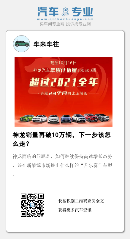 10月17日,神龙汽车发布最新销量数据,截至10月16日,神龙汽车销量突破100600辆,超过2021年全年。截至目前,神龙已实现连续23个月同比正增长。有观点乐观认为,神龙今年全年销量有望突破13万辆,实现同比30%的增速。
