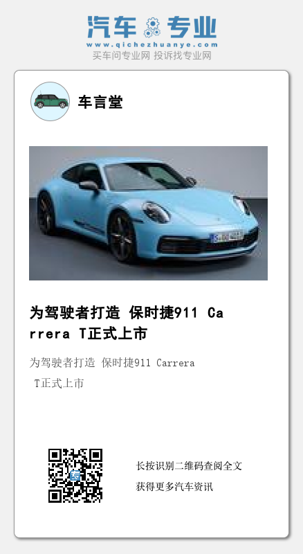 10月19日,保时捷Carrera T在国内正式上市,官方指导价145.1万元。保时捷Carrera T是一款介于Carrera和Carrera S之间的车型,T代笔“Touring”,新车定位为一款更适合驾驶的车型,并且针对车身重量、驾驶和舒适性配置方面进行了针对性调整。