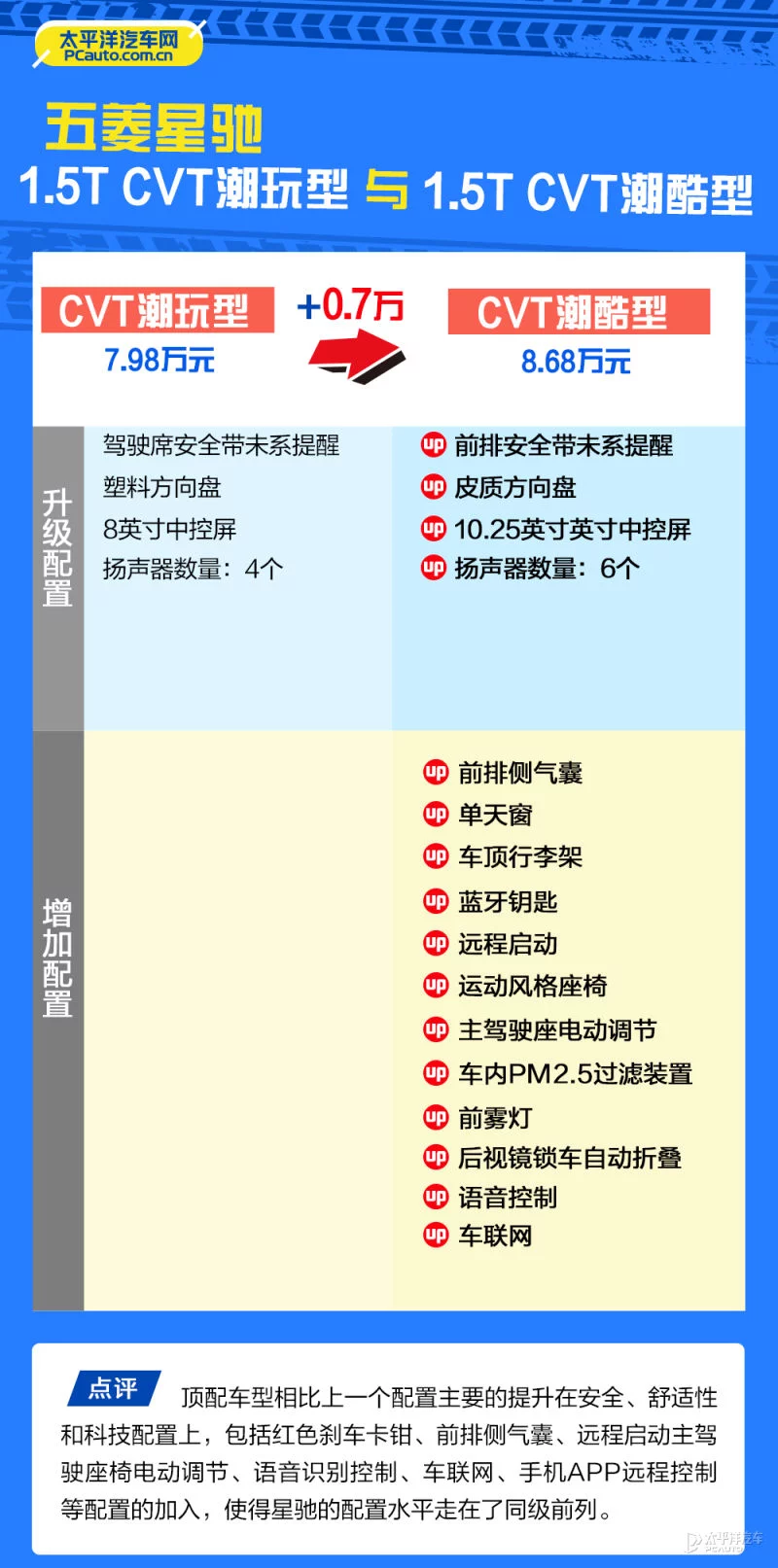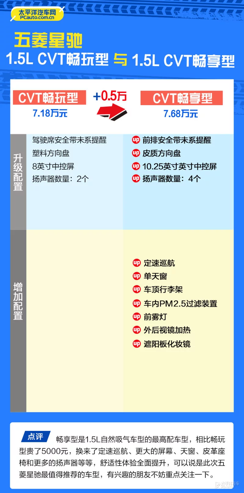 作为1.5L自然吸气车型的最高配车型,畅享型相比畅玩型贵了5000元,换来了舒适性方面的极大提升,例如定速巡航,电动天窗,车顶行李架,皮质方向盘,10.25英寸中控显示屏等,可谓是适中的价格、较为全面的配置表现,所以这个版本笔者认为是此次五菱星驰最值得推荐的车型了。