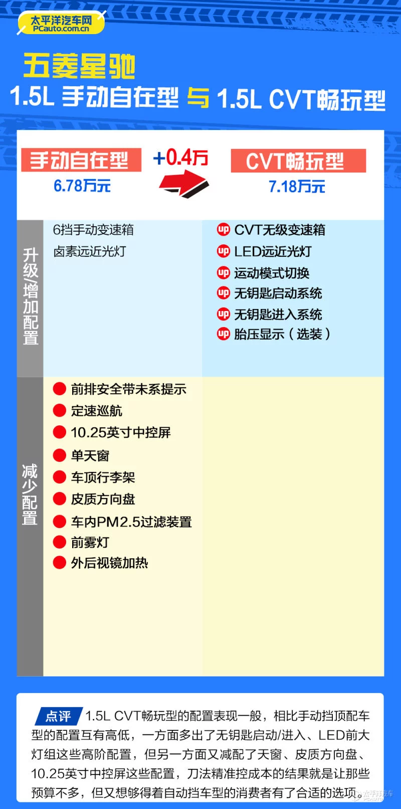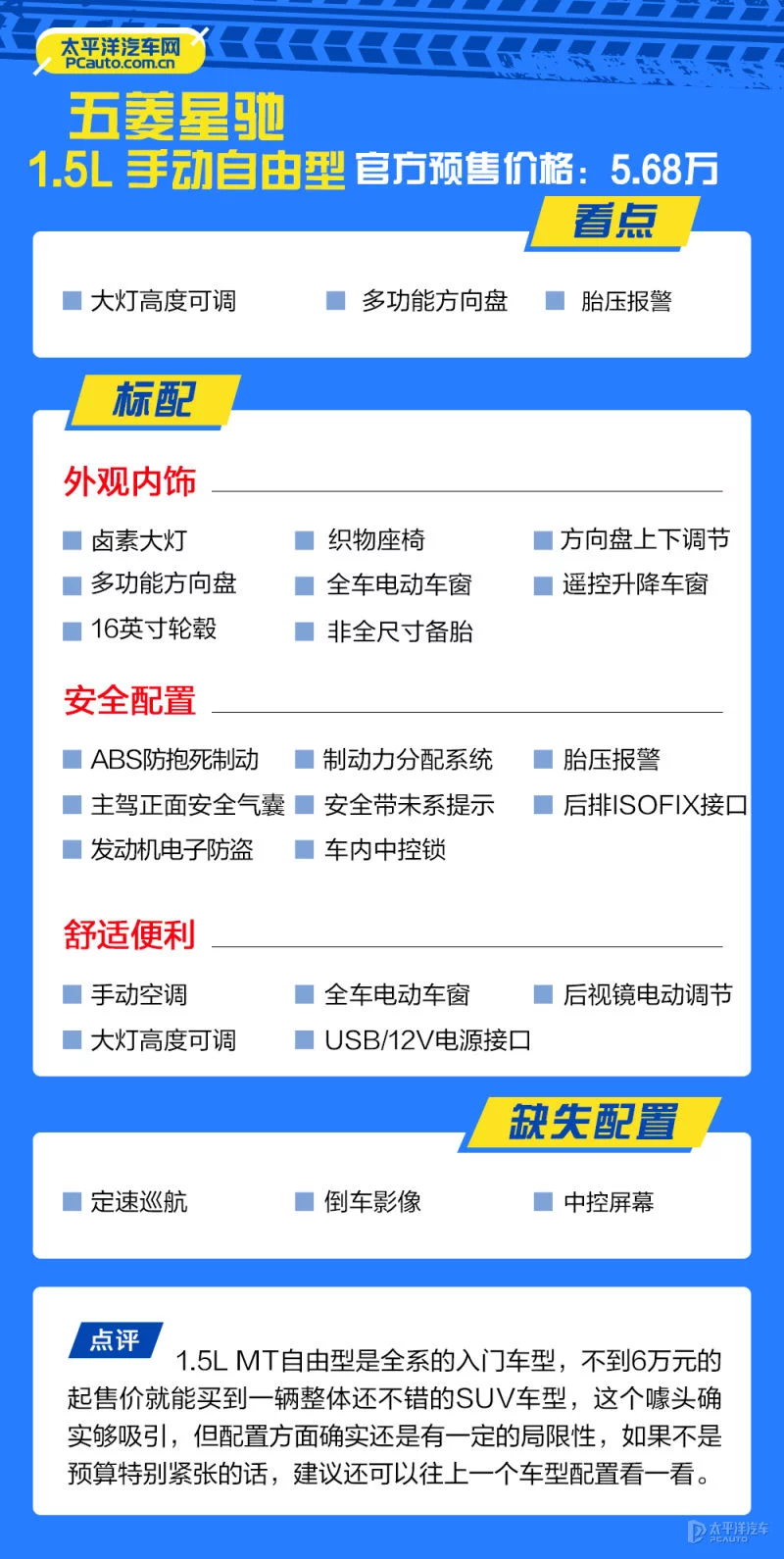 作为全系的最低配车型,1.5L MT自由型的售价虽然足够低,但从下图可以看到,其相对应的配置也比较简单,包括像中控大屏、定速巡航这些实用性较高的配置均未配备,所以相信官方推出这个版本更多是为了拉低起售价来吸引眼球罢了,实际门店终端可能并不会销售此车型,所以在此也不多做推荐。